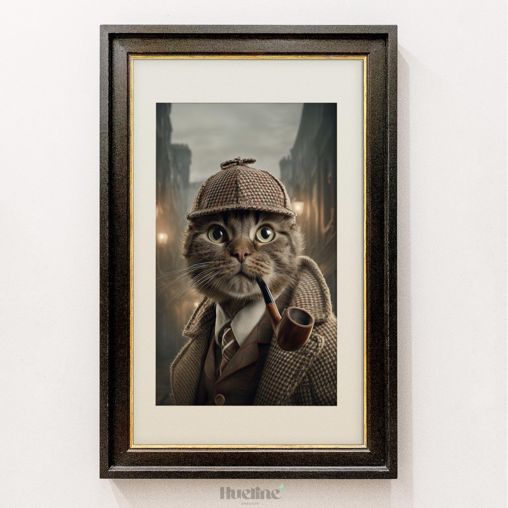 A charming portrait of a clever feline detective, dressed in Holmes–style attire complete with tweed coat, deerstalker hat, and pipe. Perfect for cat lovers, mystery fans, and those who adore whimsical, story-filled wall art. This unique pet portrait blends vintage style with cinematic detail, making it an ideal gift or centerpiece for your home decor.