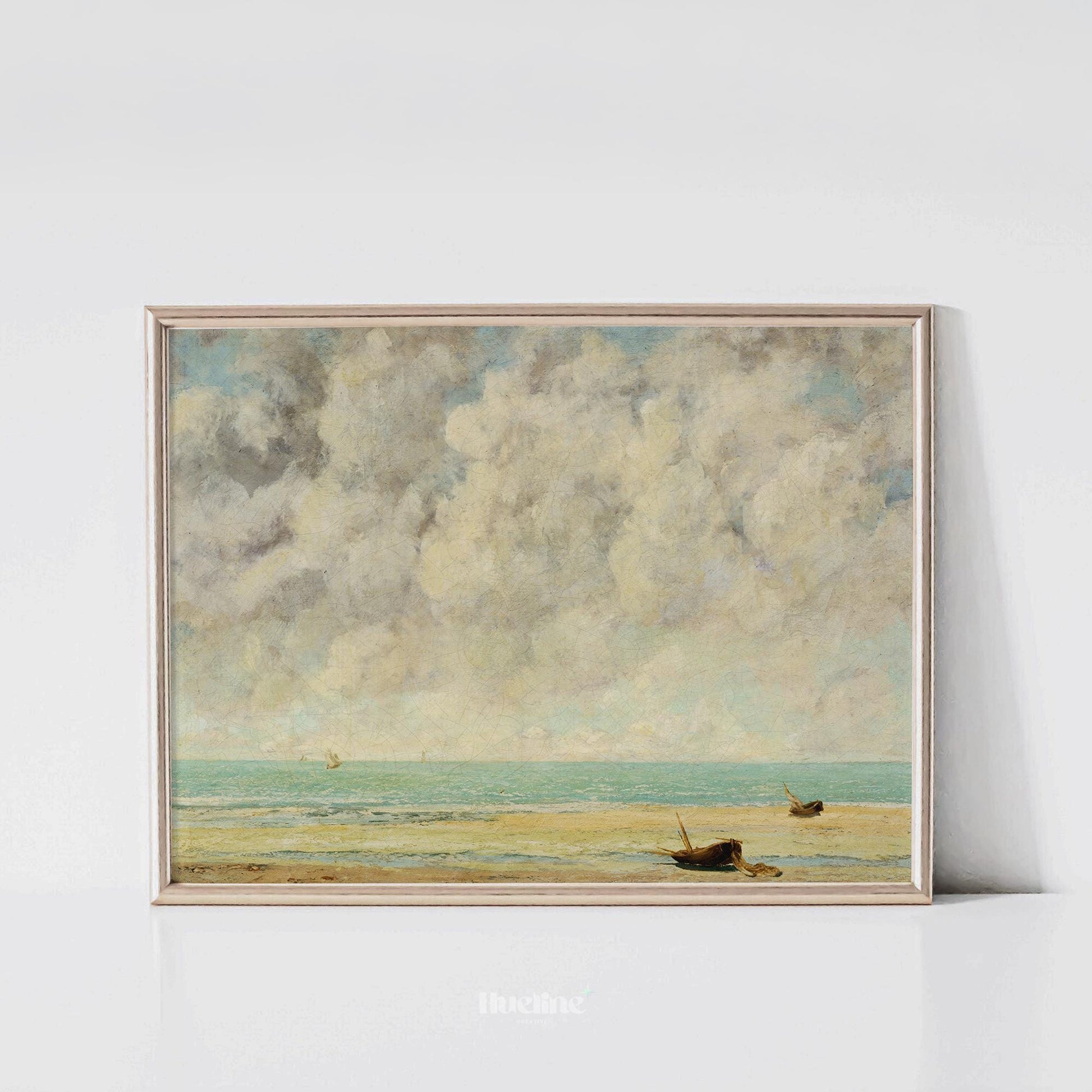 Beautiful vintage seascape painting with boats resting on the shore under a dramatic sky. A timeless coastal artwork for elegant home decor.