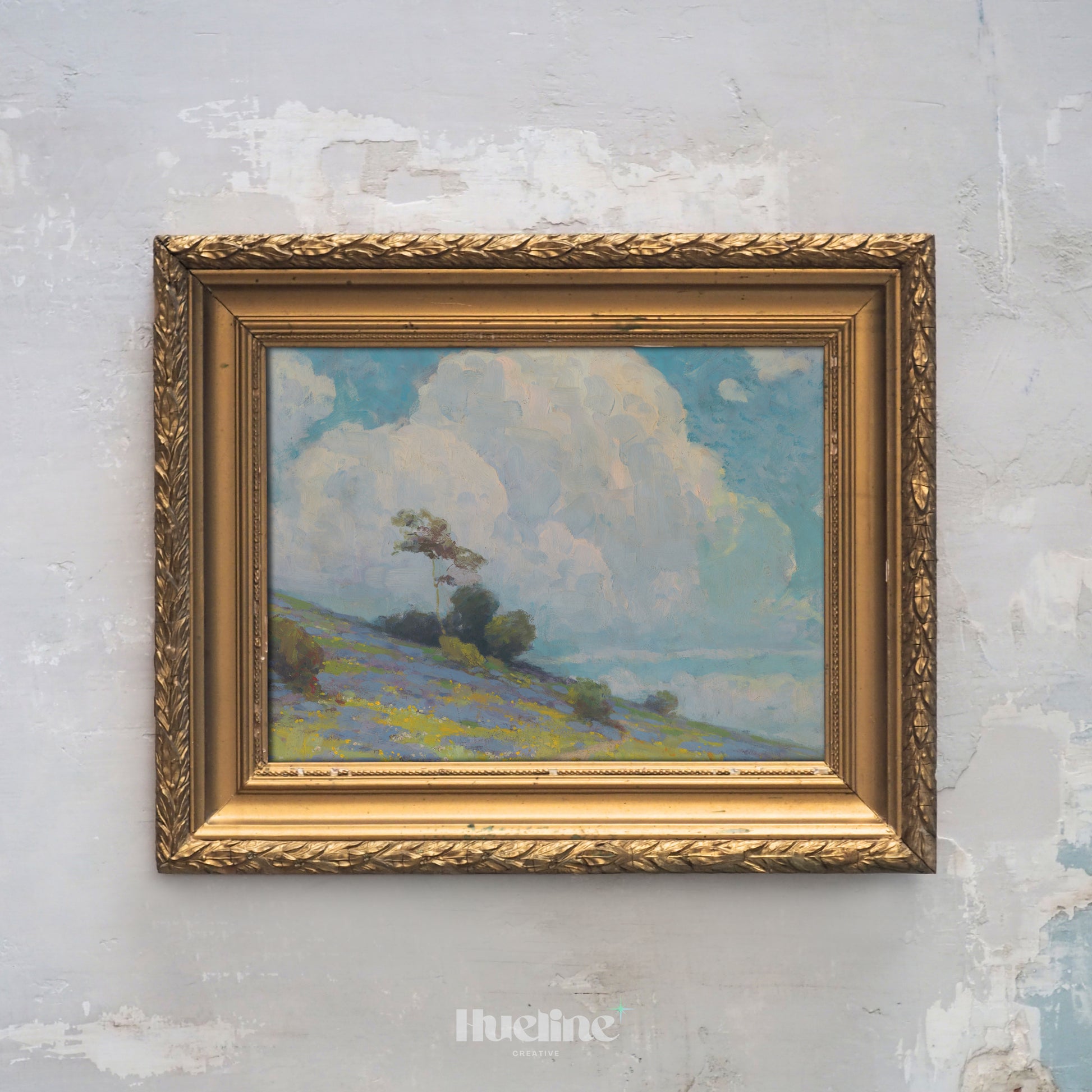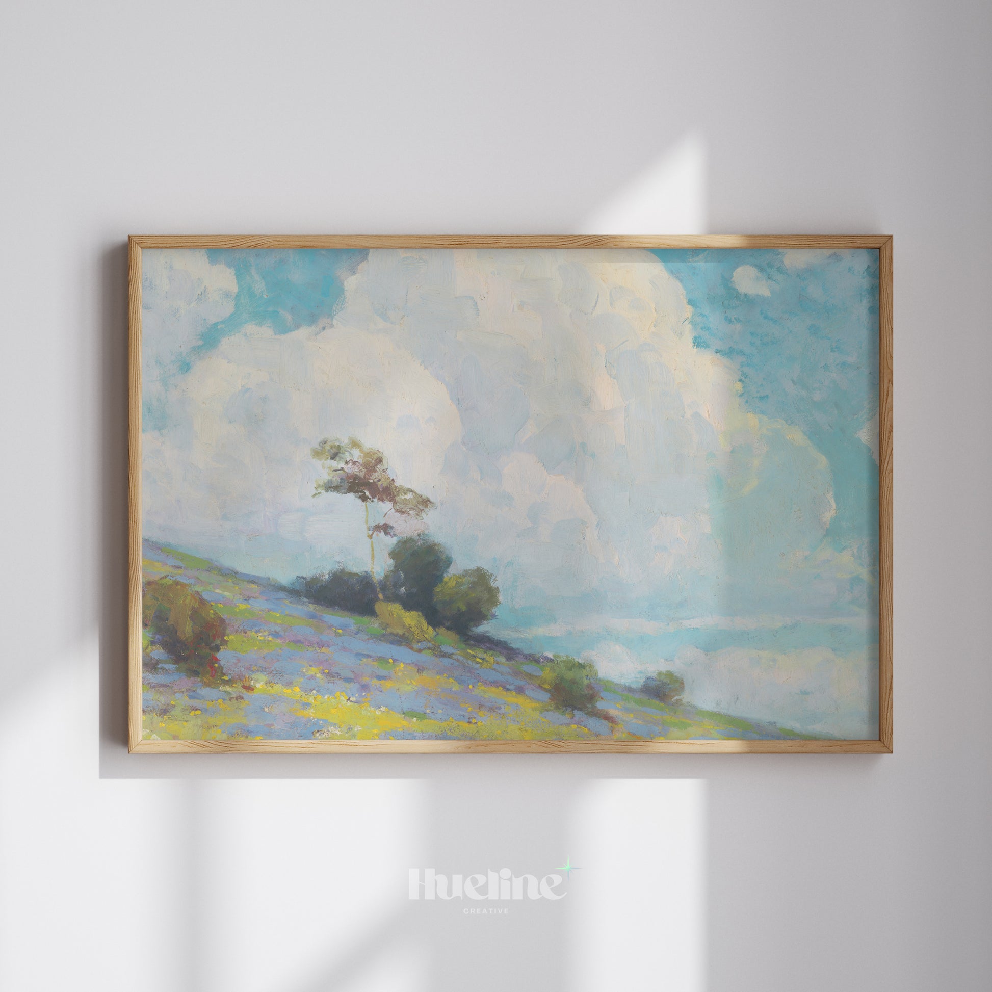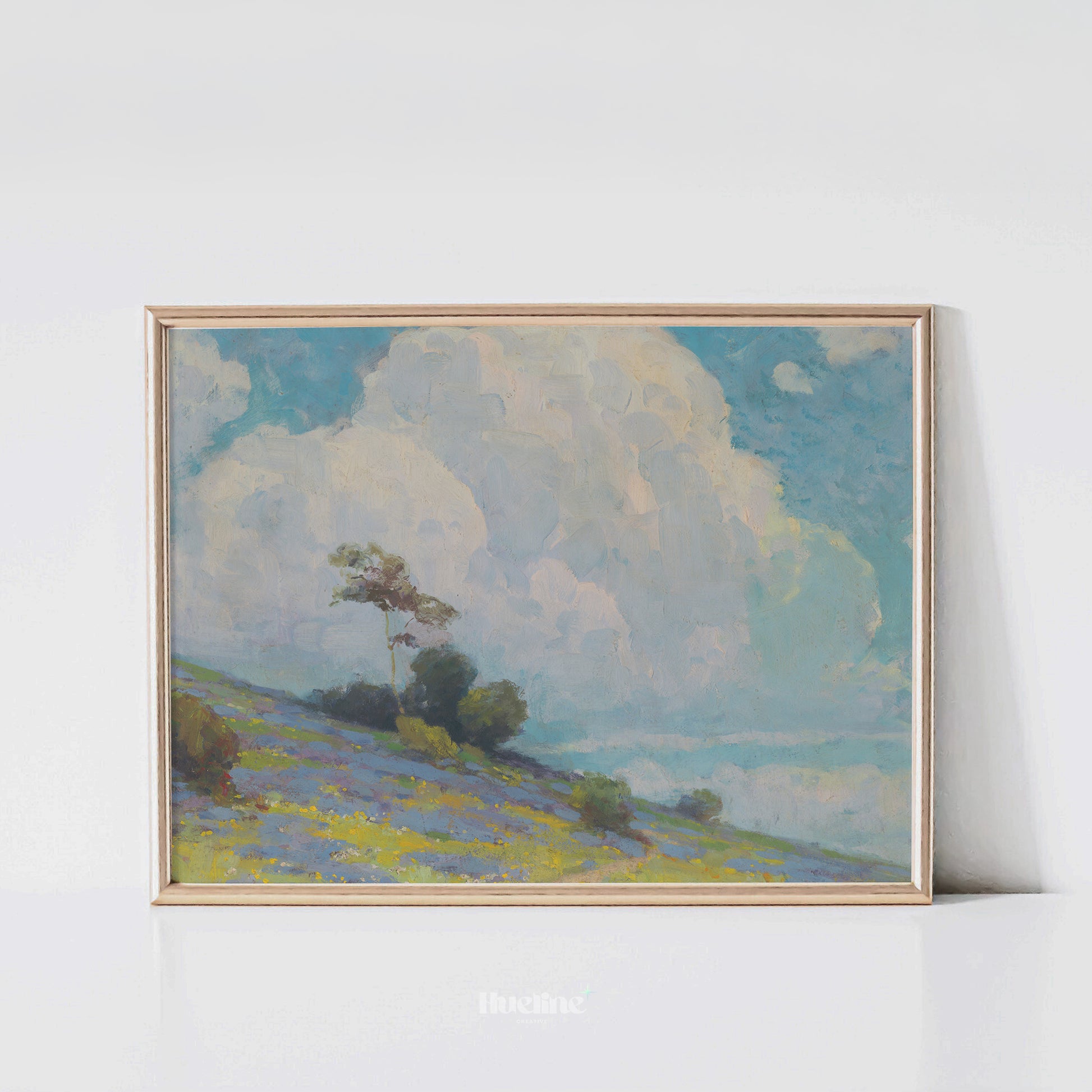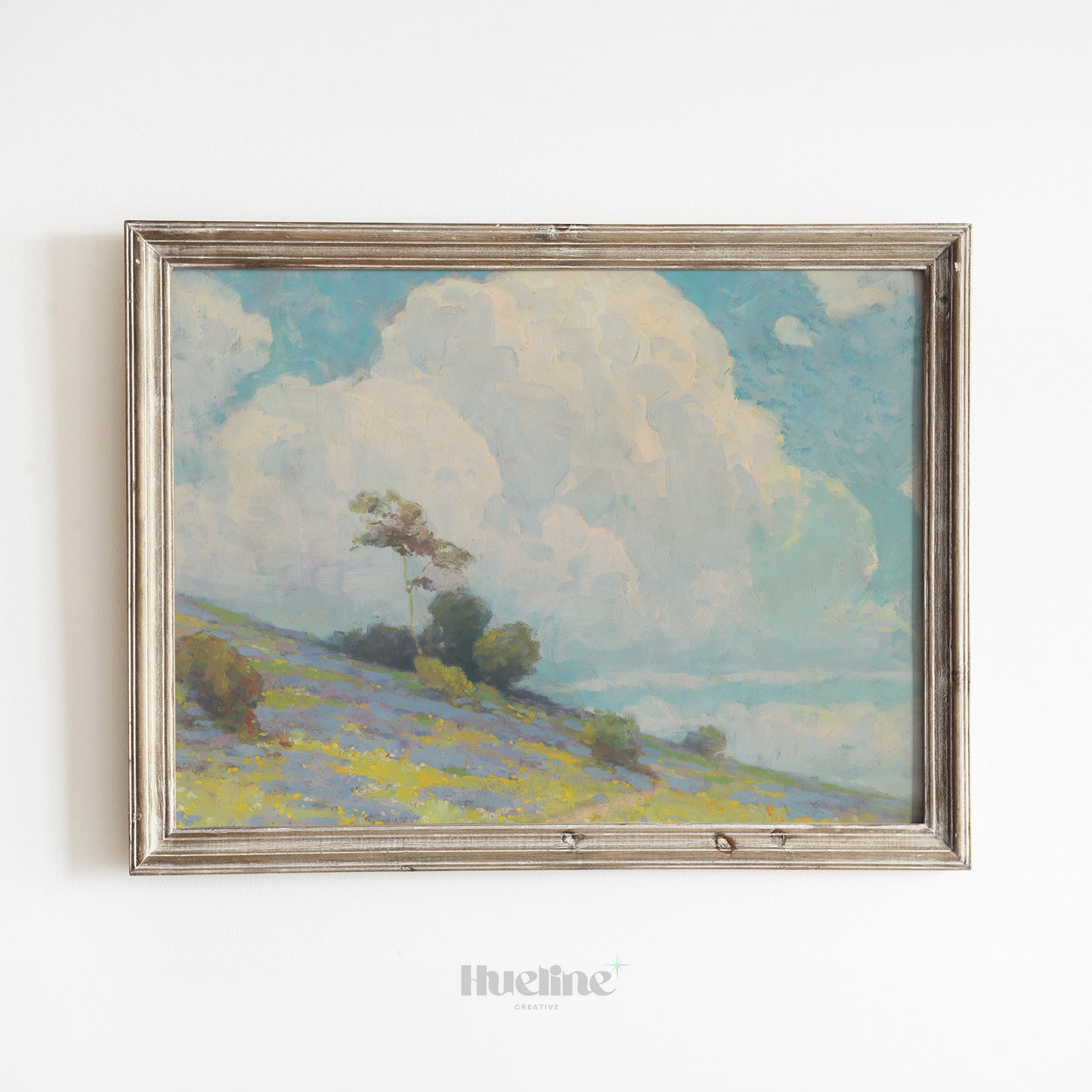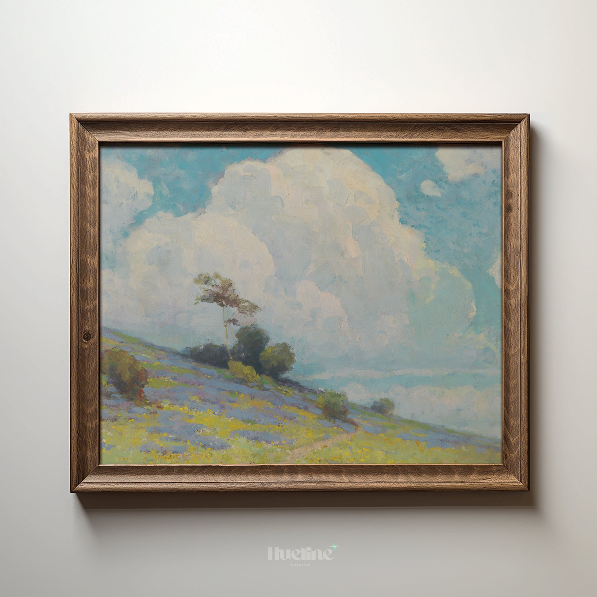 Vintage Landscape Wall Art | Cloudy Sky and Meadow Hill Painting Print - L1107