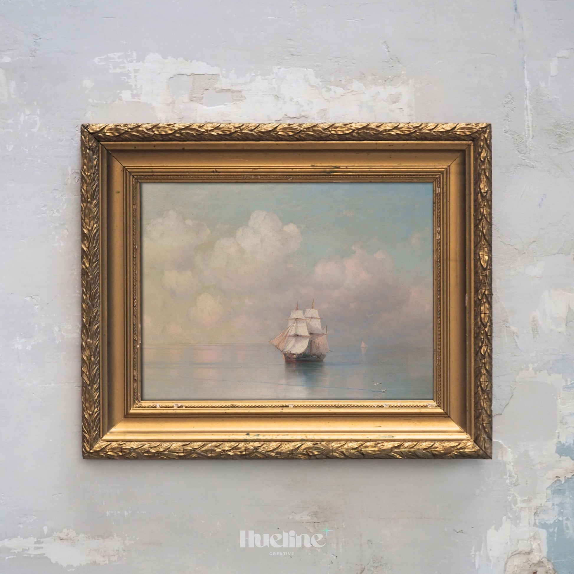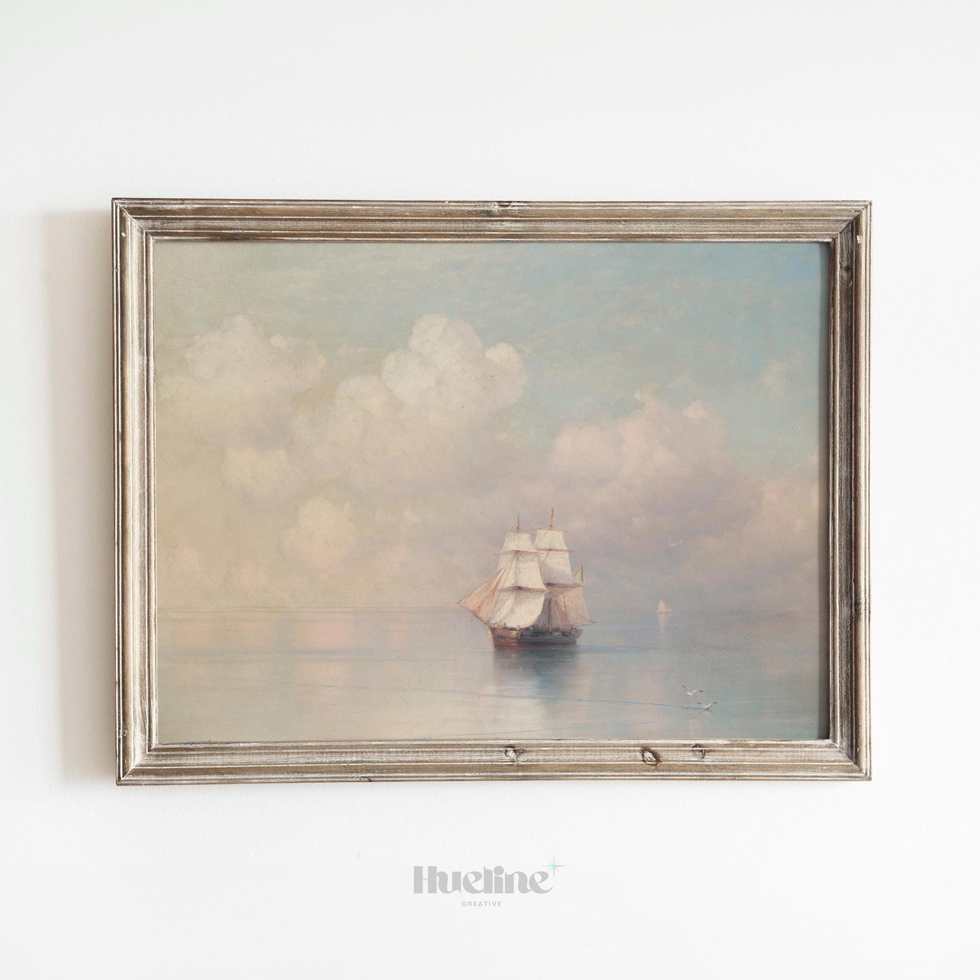 Elegant vintage nautical painting of a sailing ship on calm waters under pastel skies. A timeless maritime artwork for coastal home decor.